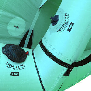 The wing features two highly efficient inflation valves: one on the central strut and one on the leading edge. These two areas of the wing face different forces, and thus require two different pressure recommendations. As a result, the central strut is thinner in diameter and gains in rigidity thanks to its independent valve that allows for a better control of its pressure.